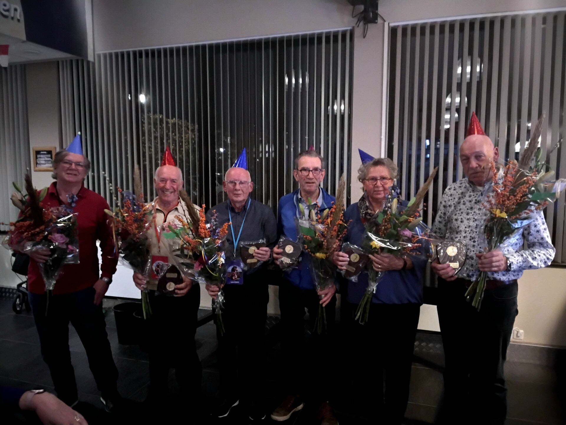 Deze avond werden zes jubilarissen gehuldigd: Leo de Wit, Leo van den Heuvel, Tinie Verstegen, Ben Spierings , Maria en Wim van Son.